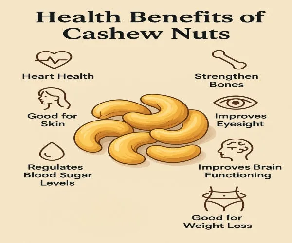 5. Cashew Nuts Regulates Blood Sugar Levels-Cashews have a low glycemic index. They release glucose into the blood slowly, preventing sudden spikes or crashes, thus regulating sugar levels in the body. It is beneficial for preventing diabetes-related risks.